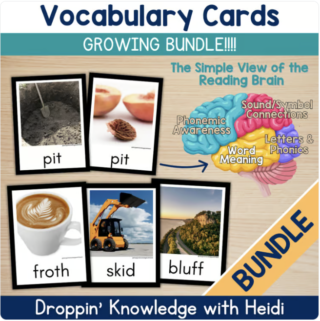 I created these cards as a way to help develop vocabulary and word recognition in early readers. When we take a look at the reading brain, we can see that meaning is important when kids are learning new words! Many of the early decodable words are words that kids may not hear often. This means vocabulary is important at even the earliest stages of learning to read!