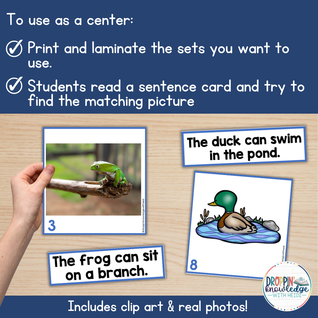 Print/laminate/cut out the cards and the sentences that you want to use. Have students read the sentence and then find the matching picture.