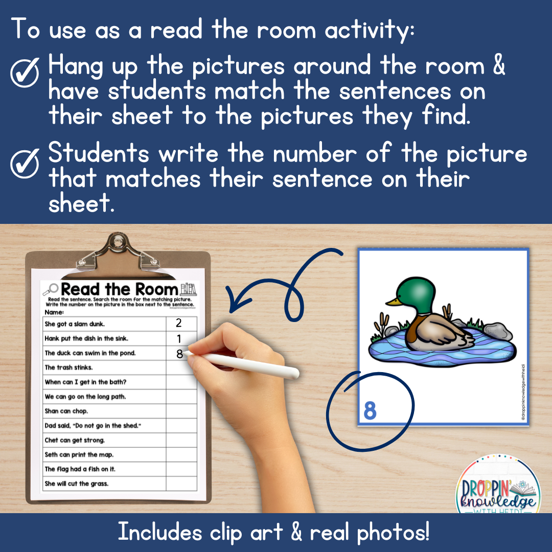 Print/cut out pictures and remove the sentences. Print a copy of the read the room page for each student. Hang up the corresponding pictures around the room. When you say go, students should read their sentences, find the matching picture and write the number on the picture next to each sentence.