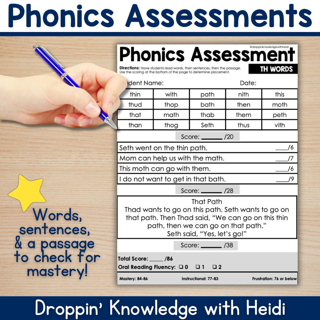 Each skill is a one page assessment and includes 2 student pages (can be printed front and back). Nonsense words are included and these are meant to check for mastery of a skill. The scoring system includes mastery level, instructional level, and frustration level (with a rationale).