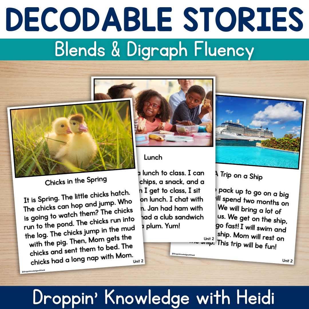 There are 10 passages with REAL photos. These passages include all the skills from UNIT 2 – blends, digraphs, and high frequency words from my scope & sequence. Words with patterns from Unit 1 are also included. There are sample comprehension questions that go along with each passage. Google slides option is included!