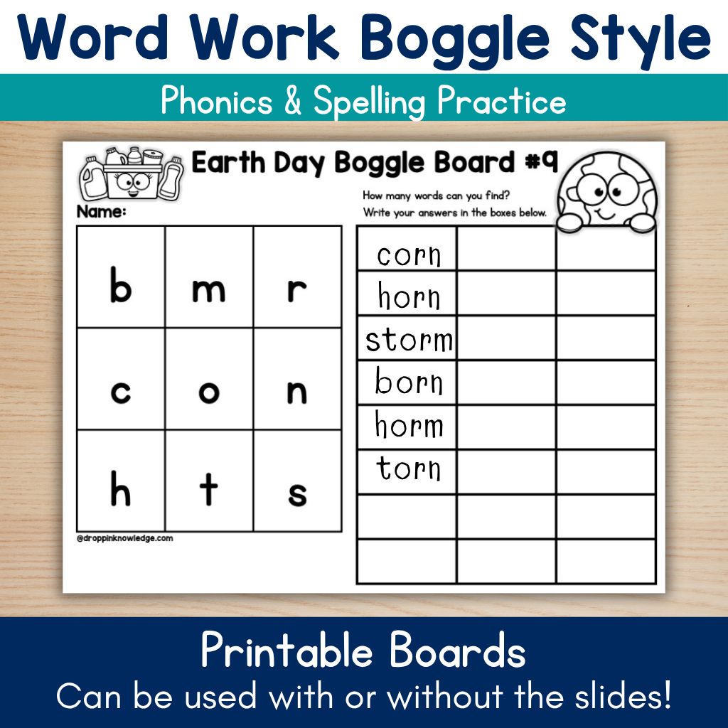 Boggle© is a fun word game enjoyed by people of all ages! I created these slides and printable pages so you could play with your students but keep the focus on skills that you have taught!