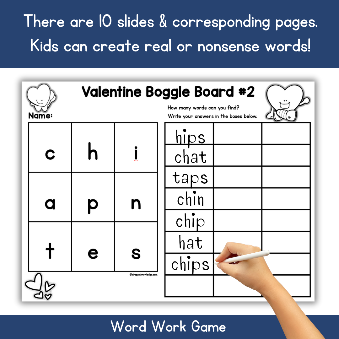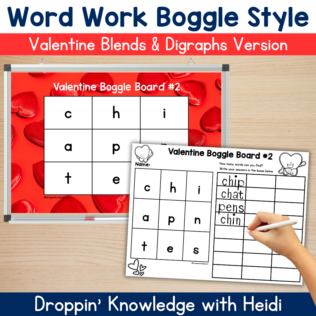 Word Work Boggle Style Valentine’s Day Boards for CVC Words, Blends, & Digraphs