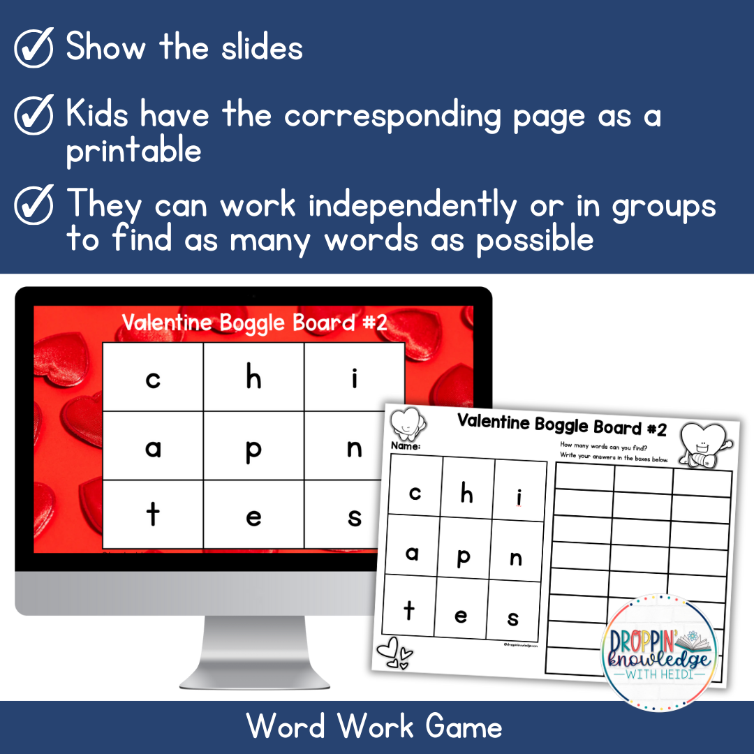 Boggle© is a fun word game enjoyed by people of all ages! I created these slides and printable pages so you could play with your students but keep the focus on skills that you have taught!